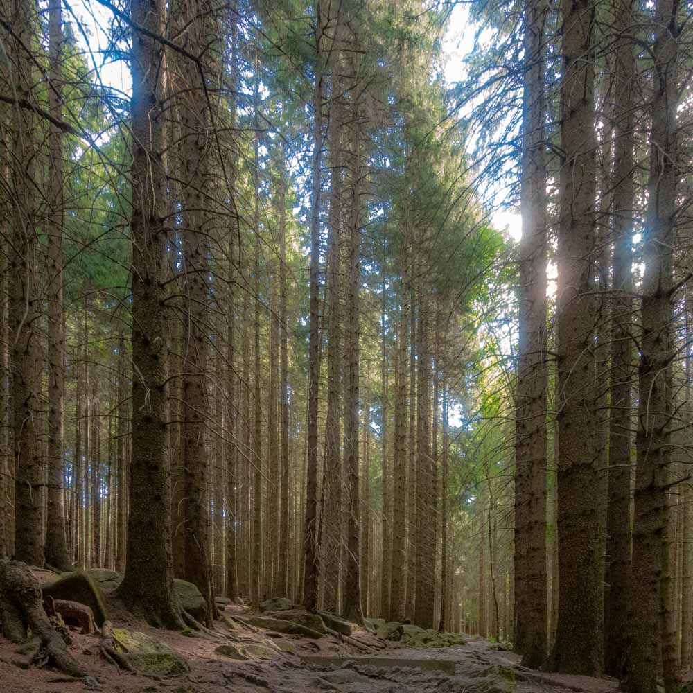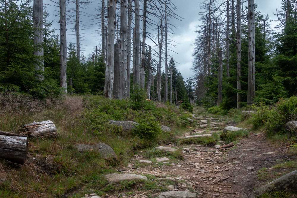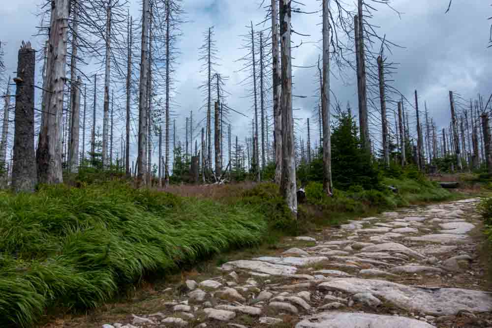 Man kann auf verschiedenen Wegen zur Achtermannshöhe gelangen. Ich bin dem Weg vom Ort Oderbrück gefolgt. Hier durchquert man auf einem mit großen Steinen befestigten Weg einen Bereich, in welchem die Bäume durch die Borkenkäfer abgestorben sind.