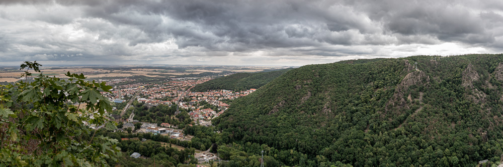Auf dem Weg nach oben hat man immer wieder schönen Ausblicke auf die Stadt Thale und das nördliche Harzvorland.