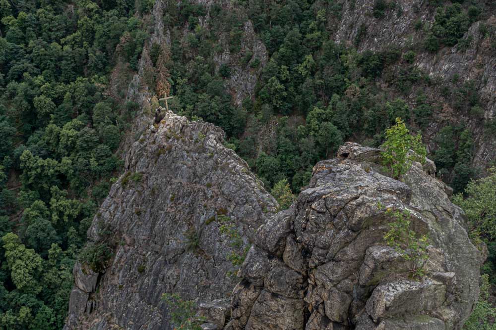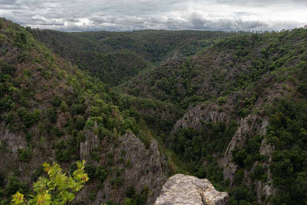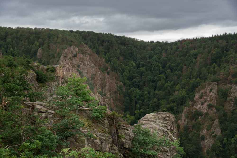 Oben angekommen folgt man dem Weg nach vorn zum Aussichtspunkt. Von hier hat man sehr schöne Blicke hinein in das Bodetal. Man erkennt, wie sich die Bode am Grunde des Taleinschnittes entlang schlängeln muss und wie rechts und links die Hänge steil aufragen.