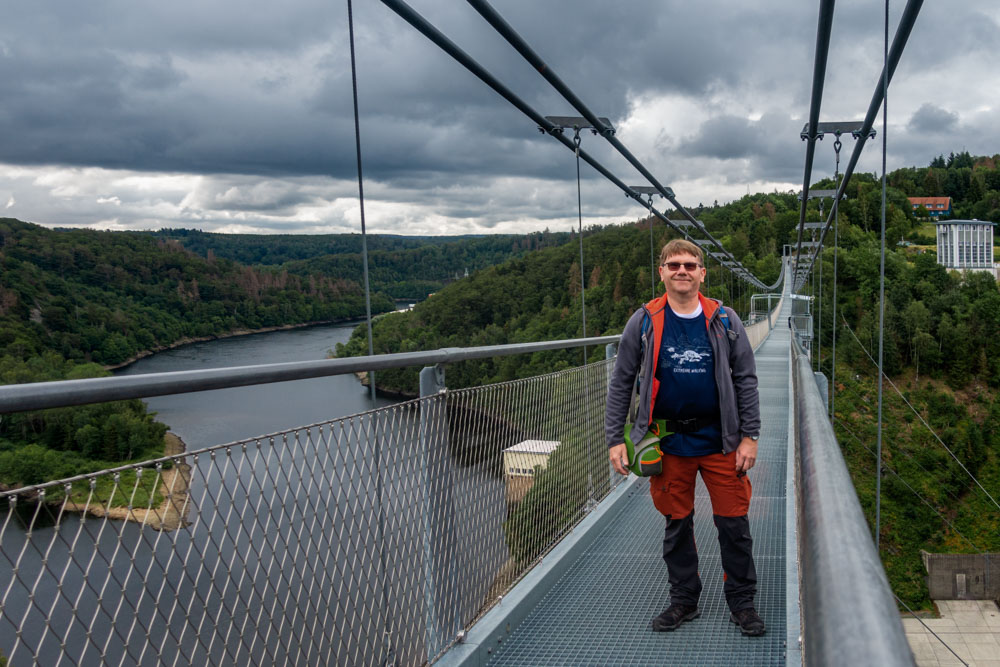 Hier überspannt eine Fußgängerhängebrücke die Talsperre Wendefurth.