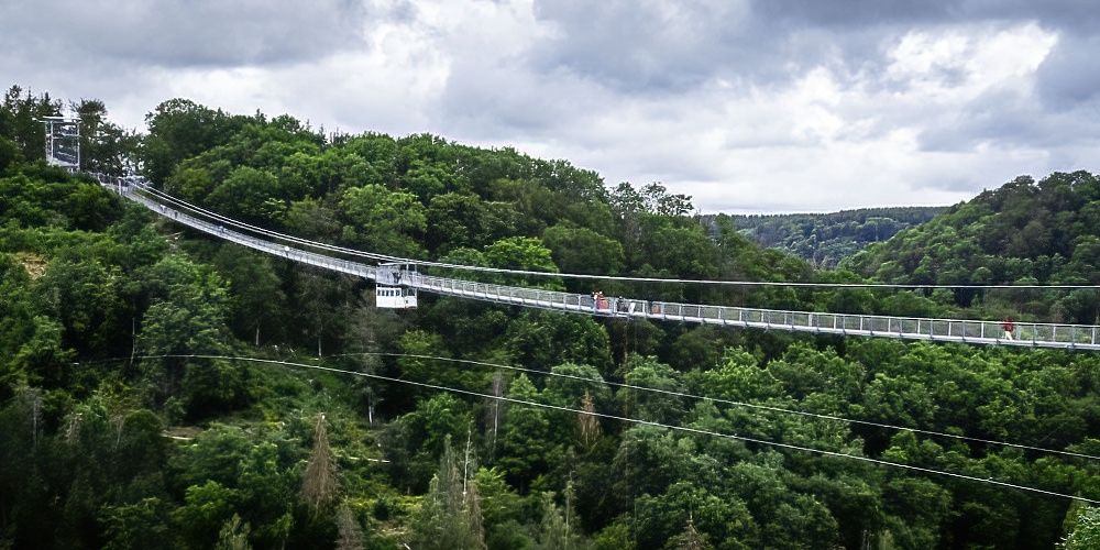 Neben der Hängebrücke gibt es noch eine weitere Attraktion. Hier befindet sich eine doppelte Zipline (Seilrutsche), welche mit ihren 1.000 m Länge die längste Doppelseilrutsche Europas ist. Auch hier braucht es viel Abenteuerlust sich vom Podest abzustoßen.